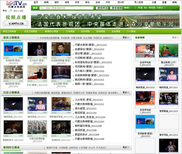 内蒙古电视台http://www.nmtv.cn/index.shtml作为蒙古地区主流的宣传窗口,多年来一直本着为大众快速传达信息的宗旨,2001年5月1日,内蒙古电视台与内蒙古经济电视台、内蒙古有线电视台合并,这标志着内蒙古电视事业又进入了一个新的历史时期。随着网络技术的不断发展以及网络全面化应用的普及,传统的电视台运行机制已不能很好地满足大众的需求,全面的网络视音频建设势在必行。经纬中天作为视音频系统开发领域的领导厂商,积极参与广电行业网络信息化的建设,为其提供了完整的网络电视台建设解决方案,充分满足了用户的不同需求,在行业内得到了用户的高度认可。(http://www.nmtv.cn/index.shtml)