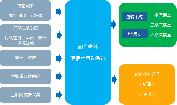 经纬中天采用平台化搭建,其采用规范化、多渠道汇聚接入方式为青岛广播电视台在完成蓝晶APP、广播汇聚系统、台内微信与微博、三方大数据分析系统等数据信息对接的同时建立专用信息资源及数据分析系统。可在十层、六层各演播室进行节目录播与直播时与包装展示系统数据输出对接,并实现为台内今日青岛、晚间新闻、爱青岛等栏目播出时提供重要的融合媒体数据信息素材、分析以及互动应用支持。