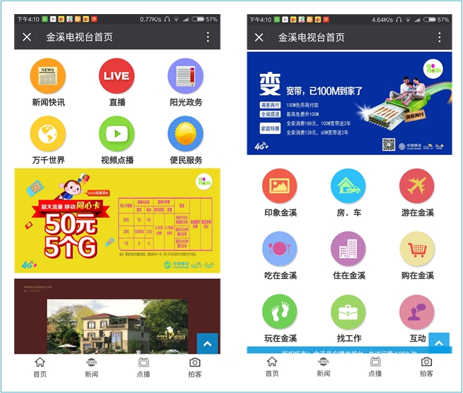 北京经纬中天信息技术有限公司联手抚州移动建设金溪广播电视台手机客户端和手机微网站。实现了金溪电视台视频直播、视频点播、新闻快讯发布以及违章查询、金溪公交、水费查询、天气查询等便民服务应用。支持拍客功能,互联网用户可实时通过手机上传身边新闻,实现新闻线索的海量汇聚。