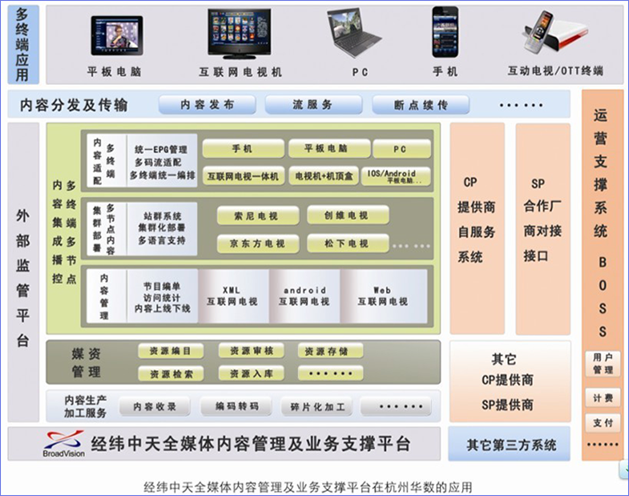 1、茁壮IPANEL等互联网电视产品接入:经纬中天互联网电视业务平台针对ipanel等中间件产品进行了前置封装,完成EPG内容编排后可自动实现门户内容的展现发布,大大提高了该类OTT终端应用的先效率。
