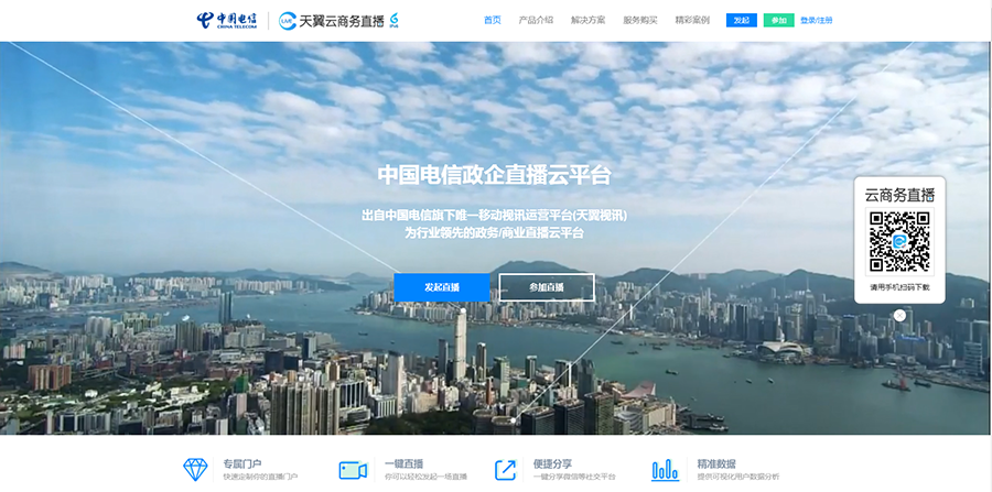 云商务直播是中国电信旗下,孵化于电信视频产业基地,针对于企业的专业直播服务平台。为政企及行业用户提供全流程、一站式、专业化、个性化的直播服务和直播解决方案。