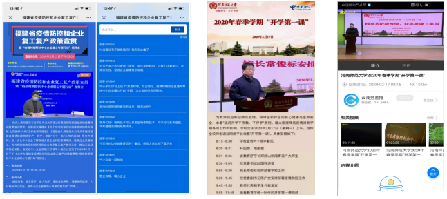 为阻断疫情向校园蔓延,教育部要求2020年春季学期延期开学,并提出利用网络平台,“停课不停学”。为响应这一政策部署,中国电信“天翼超高清” 基于互联网5G高清核心技术,联手“朴新教育”、“新东方”等多家教育伙伴,重磅推出“云课堂”系列课程,为3-18岁学生群体开展远程线上教学服务,保障防控疫情期间学校“停课不停学”。为确保疫情防控和教育教学工作“两不误”,天翼视讯协助全国学校迅速行动、周密部署,通过天翼云商务直播业务开展线上授课方式,保障“延迟开学不停教、不停课”。学校范围覆盖小学、初中、高中、大学,包含西安交大、上海大学、河南师大等。截止3月4日,天翼云商务直播抗疫期间累计新增账号2000多个,累计完成直播4万场次。教育局点播课堂累计课程近7千节,累计访问量突破7千万;网校点播课堂累计课程超800节,累计访问量超72万。