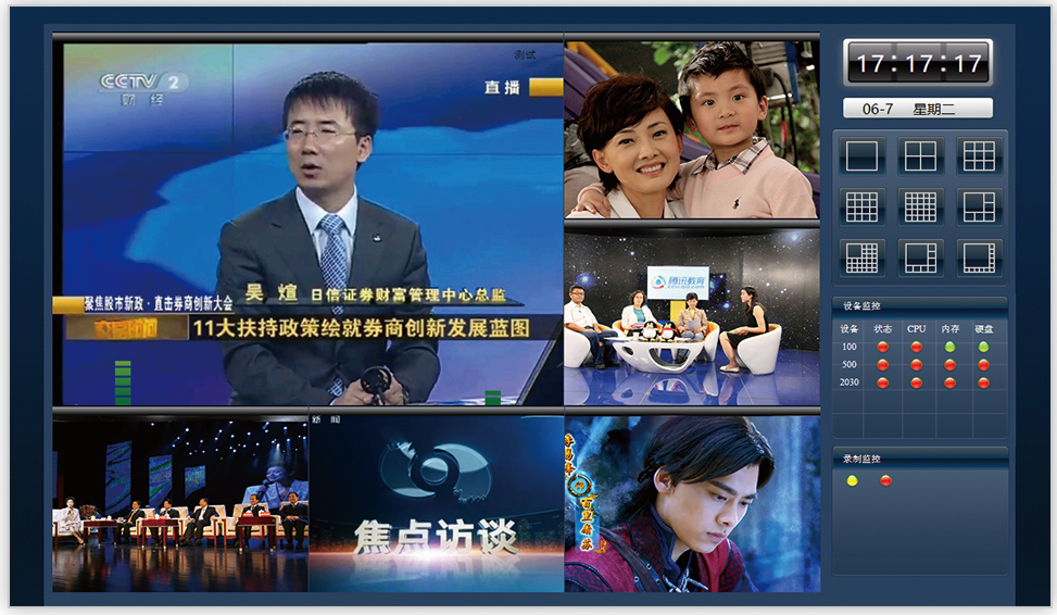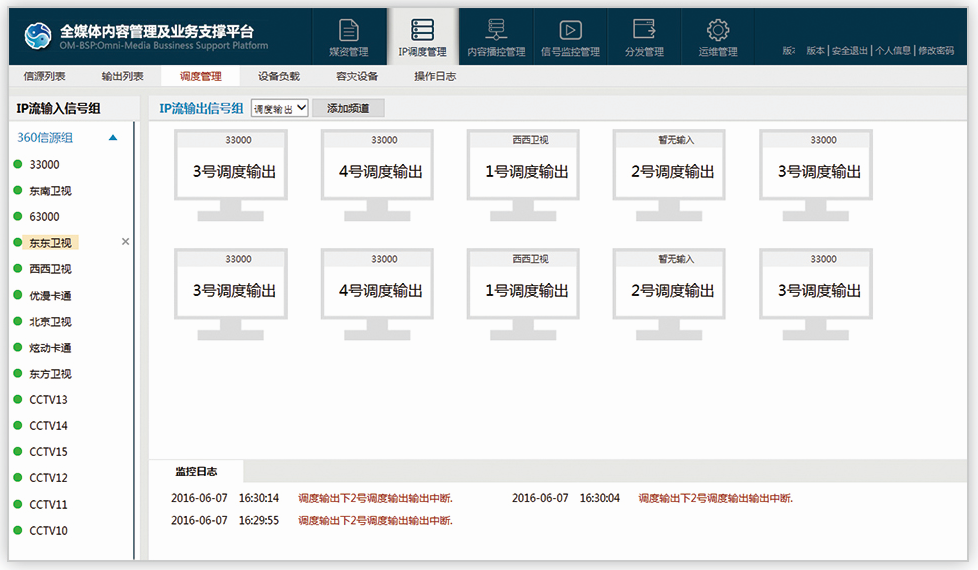 IP流调度:将IP流编码器中完成编码的节目信号、其他IP流信号、网络远程流等通过管理平台实现对大象网、APP、新媒体播控系统、第三方合作伙伴等内容应用平台进行调度输出。