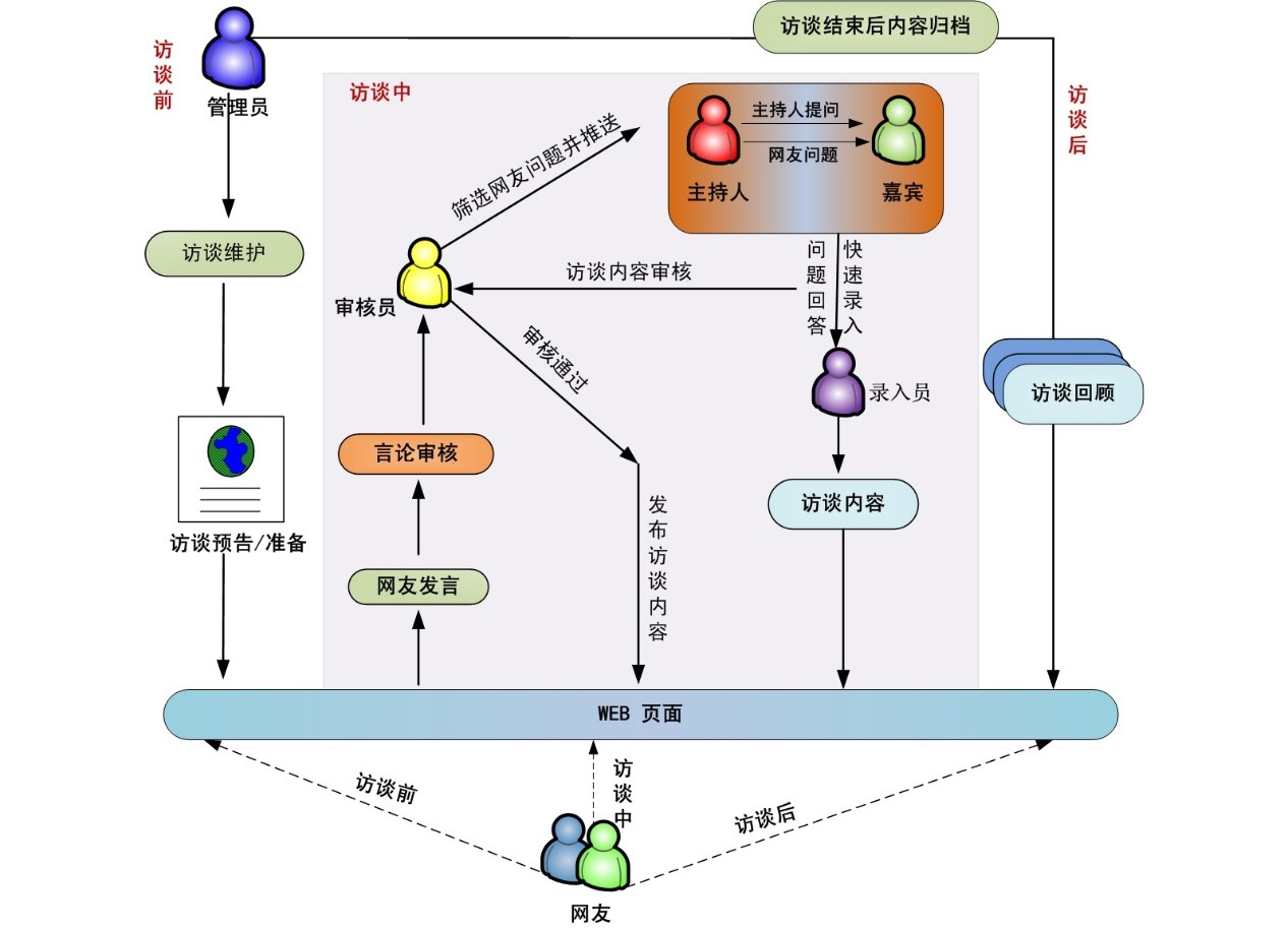 整个访谈过程可分为访谈前、访谈中、访谈后三个阶段,每个阶段都可以配置不同的呈现模板。访谈前可以预告访谈内容和访谈嘉宾;访谈中可划分多个不同角色对直播的内容进行播出控制,同时对整个访谈的内容进行审核与发布;访谈后可形成访谈回顾,以便用户进行随时回顾访问,同时也可以作为历史资料进行保存。访谈活动开始后由认证注册用户经由外网提交问题,主持人选择后向嘉宾提交,由速记员完成问题回答内容的输入与发布,实现在线互动交流。