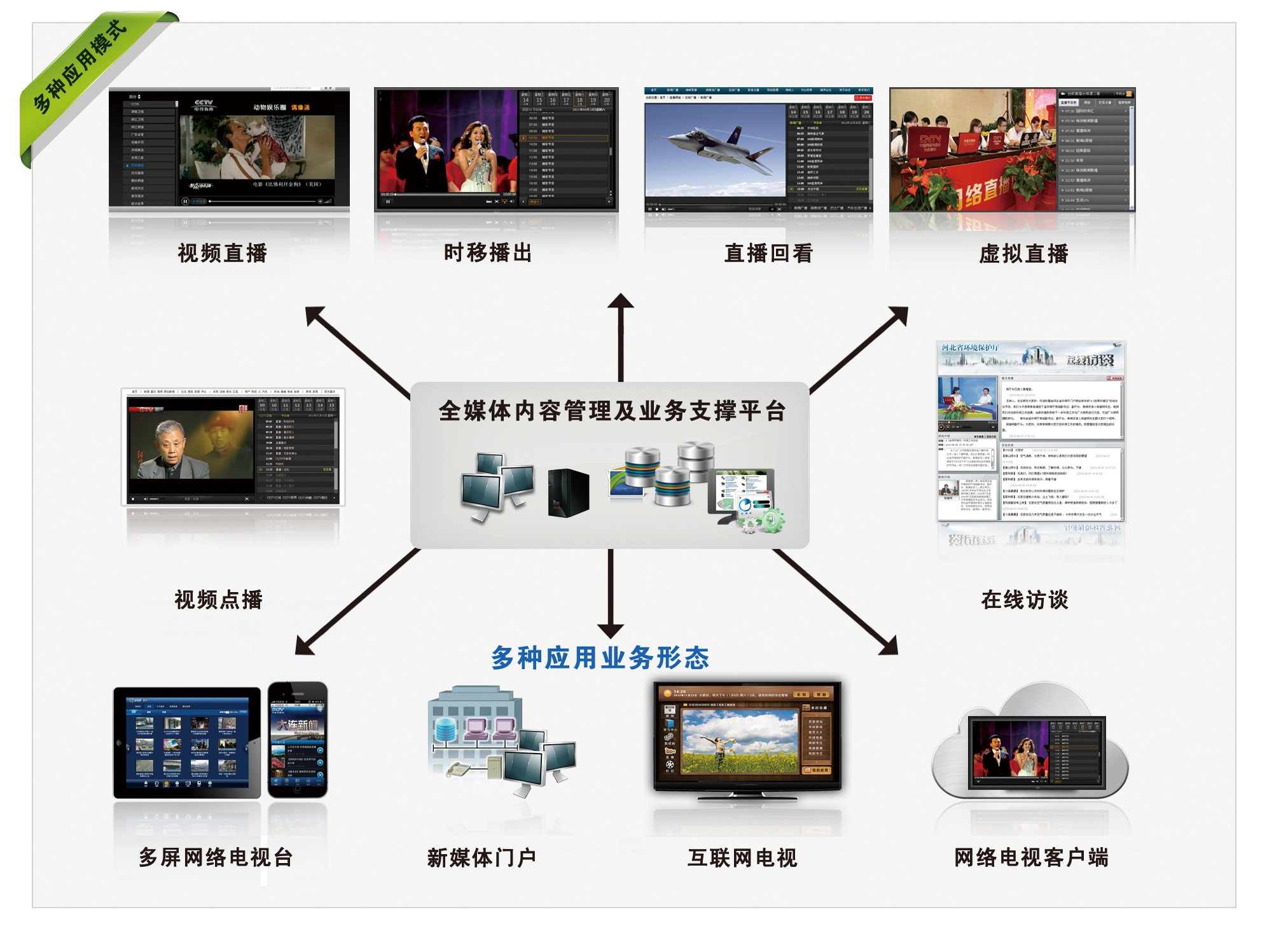 经纬中天OM-BSP平台支持建设多屏网络电视台、多屏视听门户、互联网电视、全媒体资源汇聚共享等新媒体业务,支持用户通过不同终端实现视频直播、直播回看、直播时移、视频点播、视频轮播、在线访谈、多屏互动、内容订阅等不同应用。