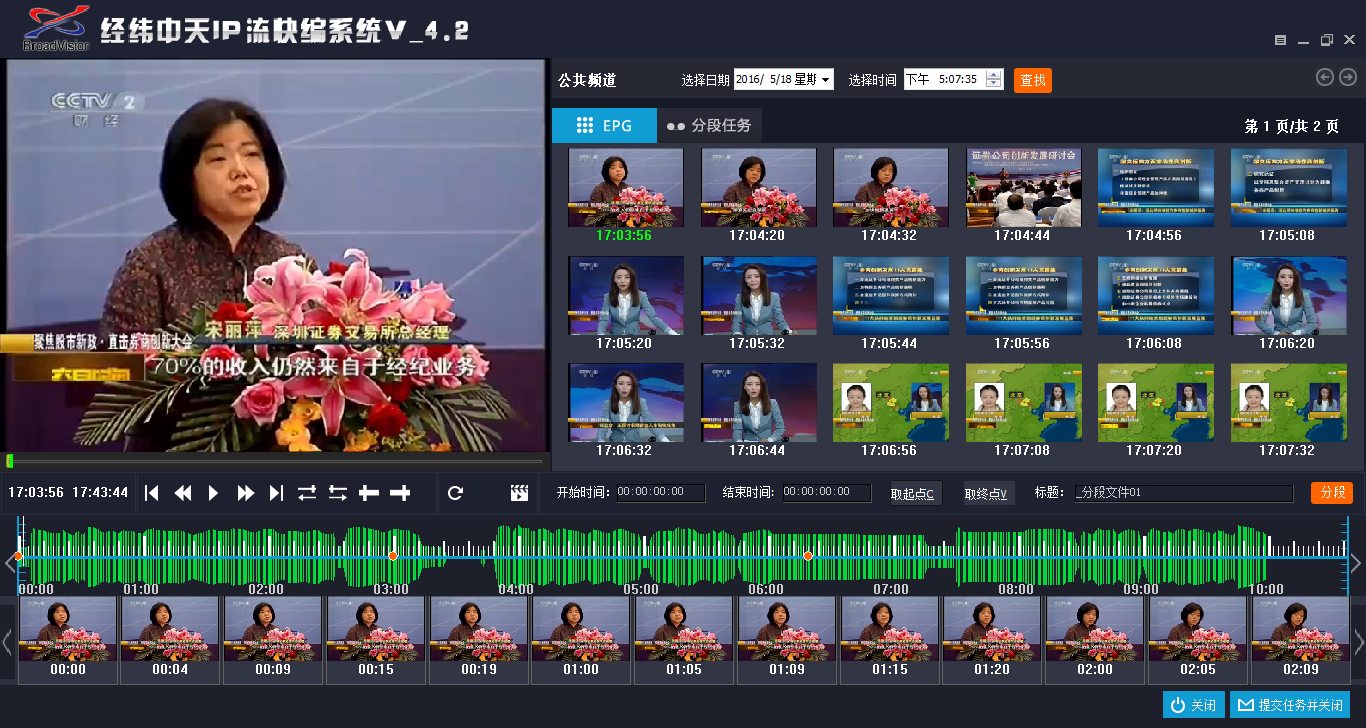 经纬中天IP视频流快编系统可对实时网络IP流、媒体资源库中的音视频节目进行精确到帧的快速物理裁切、分段、合成、截图以及添加片头、片尾、特效、编目信息、精彩镜头回放等操作,系统具有大量的人性化辅助操作功能,支持实现音视频分轨显示、快捷键操作、低码流节目预览、缩略图场景捕捉以及智能预览打点、串联单或EPG节目单导入、LOGO字幕特效等功能,能够有效协助编辑人员快递完成内容编辑与发布操作。