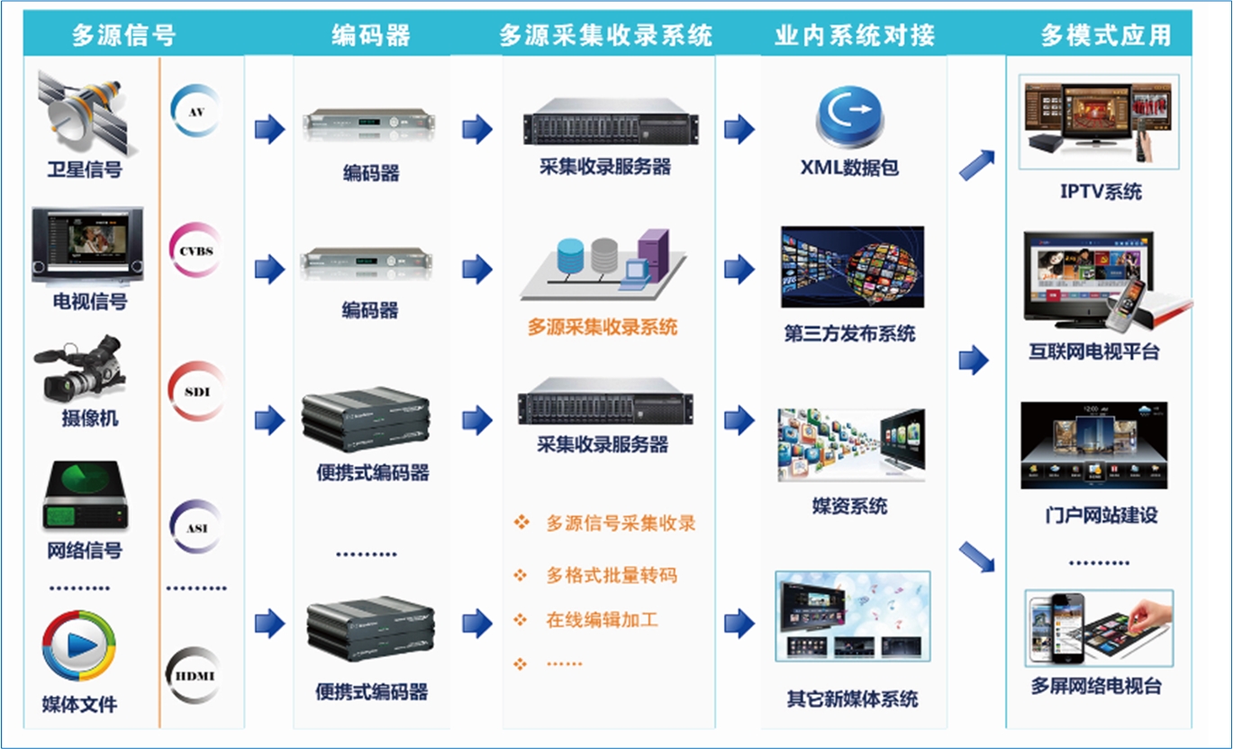 支持广播、电视、卫星、摄像设备、播放设备、网络IP流的多种节目信号内容进行统一采集、编码和多种终端流输出,支持硬件编码和软件编码两种形式,支持同一信号源同步输出基于H.264编码的RTMP(FLV)、M3U8(TS)和V8、V9编码MMS(WMV)的不同清晰度(高清、标清)码流输出。支持7*24小时全自动无人值守节目内容收录。