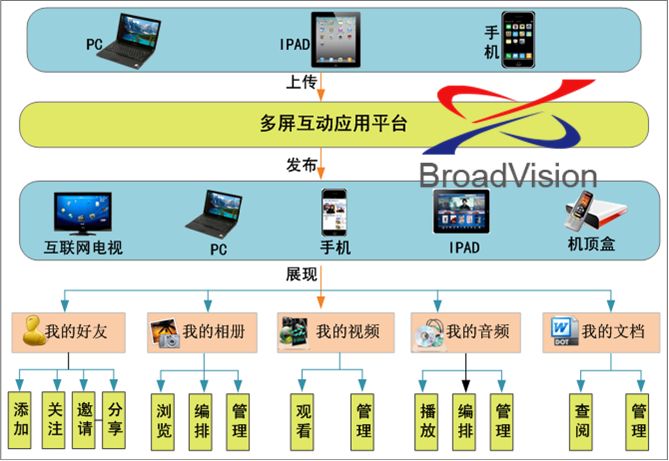 2、多屏内容分享——实现类似家庭相册、视频分享等功能,随时随地通过手机、IPAD、PC、互联网电视机等将精彩的视频、美丽的照片等共享给好友与家人。用户均可通过IPAD、机顶盒、互联网电视、手机、PC等多终端进行共享查看;