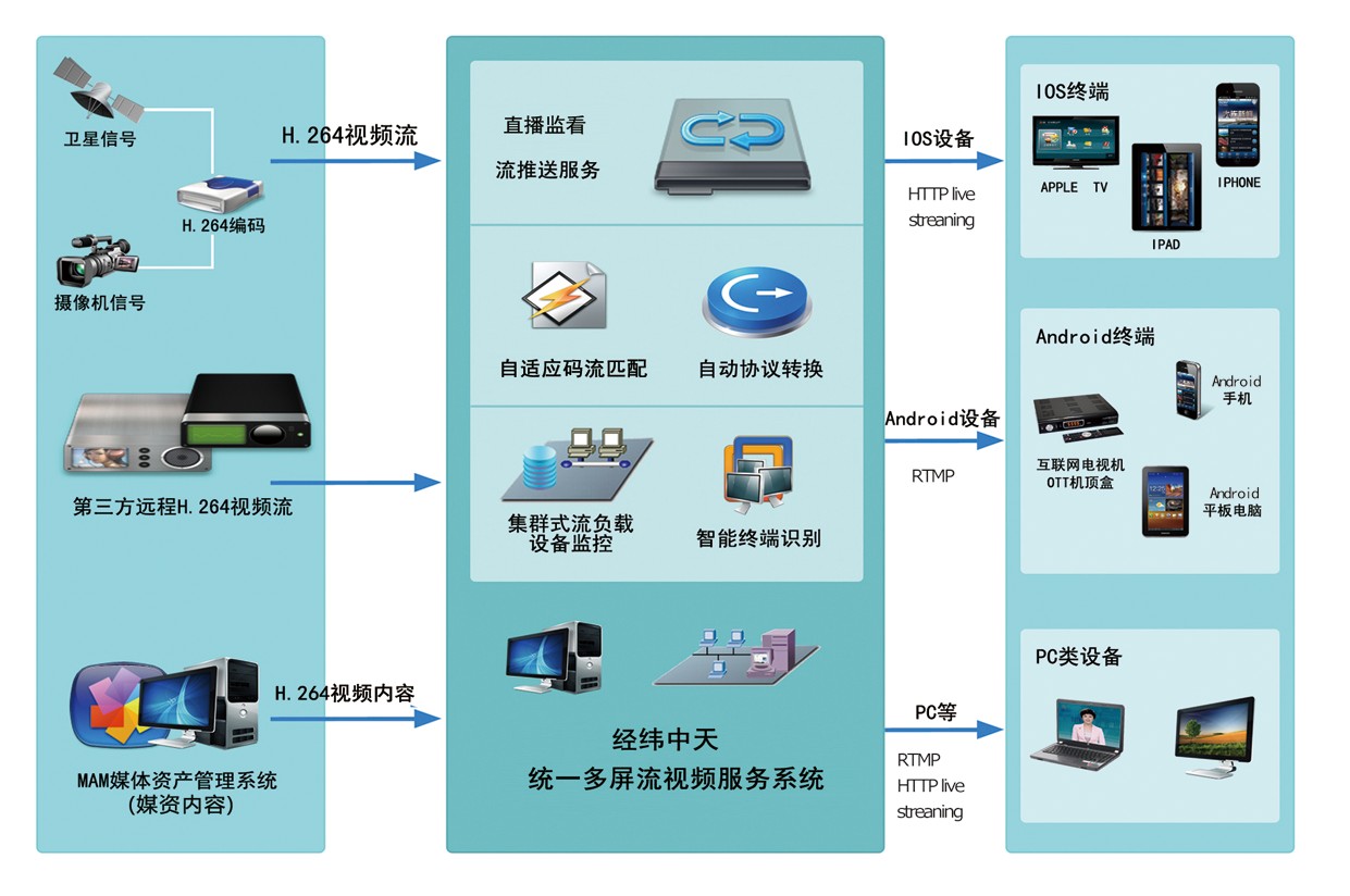 目前,经纬中天统一多终端内容编排及发布系统已在杭州华数同时支持OTT、互动电视、流媒体门户等多种不同新媒体业务的内容编排与发布,支持的终端类型包括海信Android TV、创维 XML电视、长虹IPANEL/TV、SONY BRAVIA互联网电视机、IPAD、IPHONE、Android终端及PC等。
