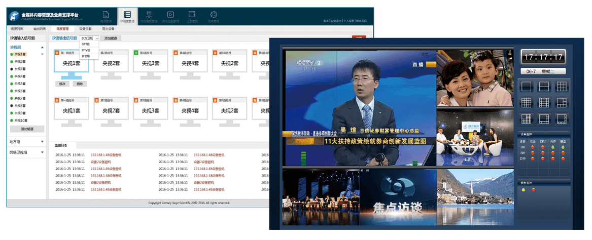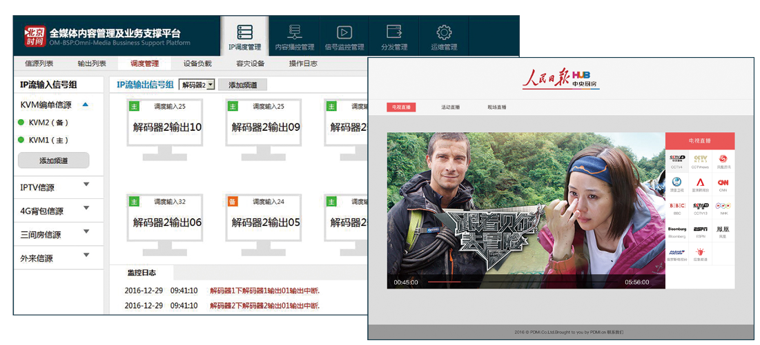 经纬中天为人民日报社提供了IP流集成调度系统、统一多屏信号发布播出系统及多屏视频直播频道管理系统。IP流集成调度系统支持实现了30Mbps组播源74路,10Mbps单播源74路,2Mbps单播源74路的信源输入及调度。统一多屏信号发布播出实现了调度信源在PC、手机、电视终端的页面发布及展现。