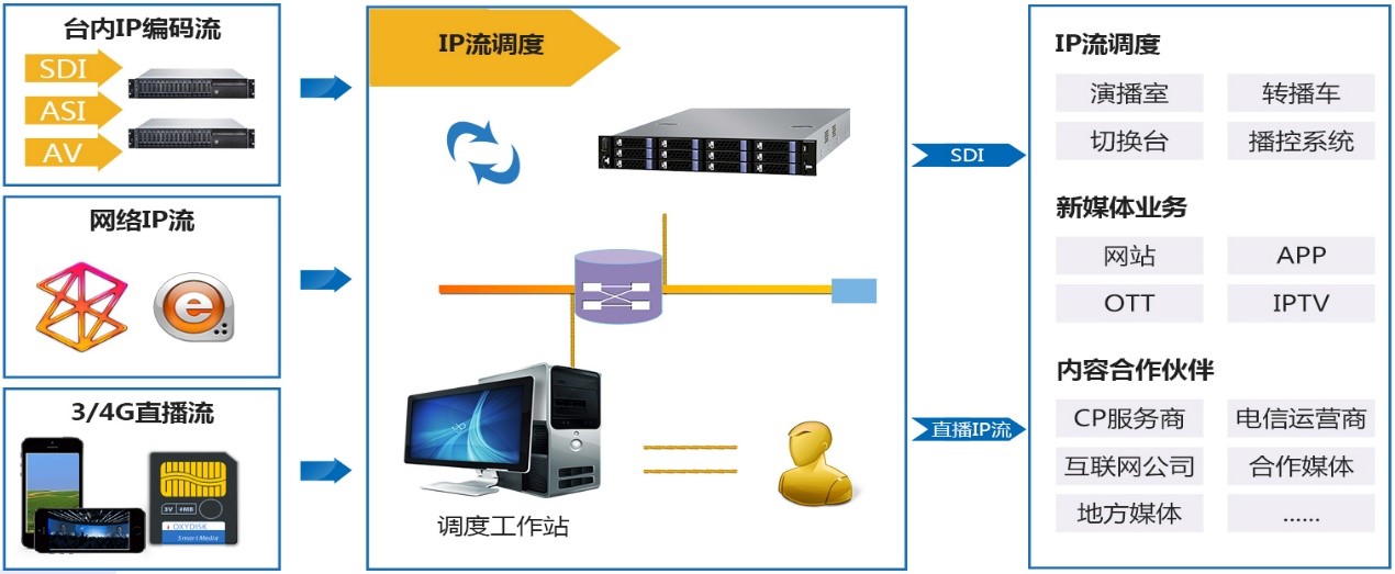IP流调度:将IP流编码器中完成编码的节目信号、其它IP流信号、网络远程流等通过管理平台实现对大象网、APP、新媒体播控系统、第三方合作伙伴等内容应用平台进行调度输出。