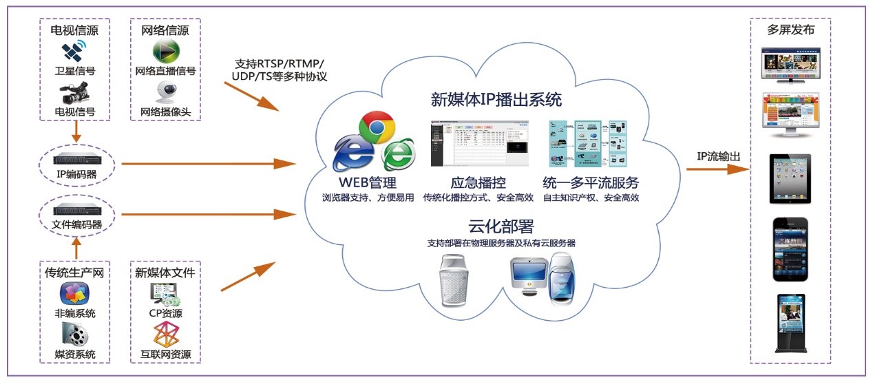 经纬中天IP流播控系统提供基于媒资库文件和IP流信号的自定义节目轮播组合与多频道管理,可针对台内传统播出系统、OTT、客户端APP、IPTV、网络电视台等不同媒体平台,提供多通道内容节目组织和输出服务,支持本地文件与IP信号的混合播出、延时播出和应急播出、支持节目间和节目内的任意广告插播、实现频道运营和广告创收,满足各类新媒体业务的自办频道建设需求,大大降低了新媒体自办频道的建设成本。