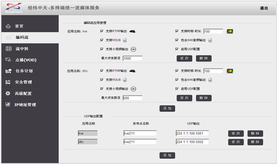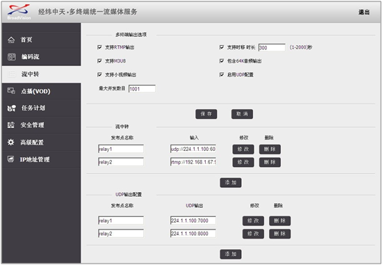 3、流中转:与业内标准H.264视频编码器或采编编码工作站结合,对UDP、RTMP协议的直播流进行中转输出,根据需求输出终端所需要的RTMP协议直播流、HTTP协议直播时移和直播时移时播放器上的小视频窗口、IOS系统标准的M3U8切片文件和音频文件、UDP协议的直播流等。