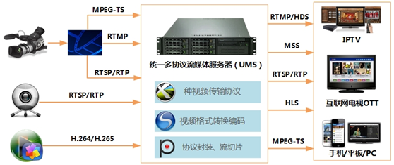经纬中天统一多协议流媒体服务器(简称UMS)是一款支持PC、手机、平板、互联网电视等多终端的流媒体播出服务器。集多种视频传输协议、视频格式转换编码、协议封装、流切片等技术于一体,支持将H.264格式的TS、UDP、RTMP、HTTP或流媒体文件统一转换成适合多终端播放需要的不同协议、不同码流和不同封装格式的视频流,以实现同一视频流或节目源在不同类型终端自适应播放的目的,可直接取代国外类似Wowza/FMS等产品。