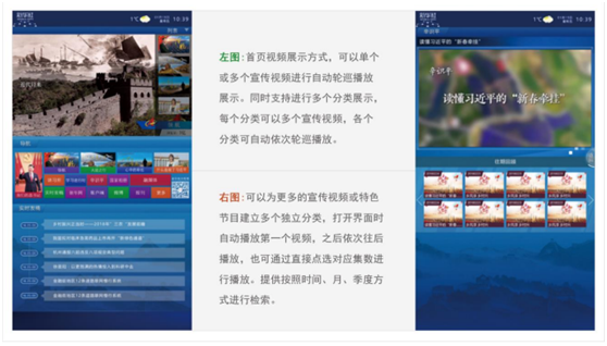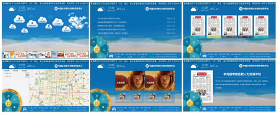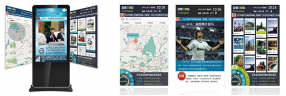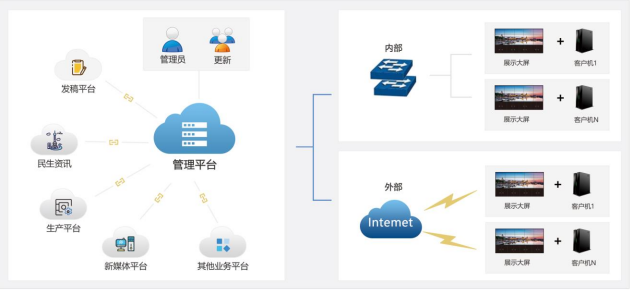 大屏发布平台前端可以对接如发稿、内容生产、实时直播信号、新媒体业务、电子报刊、民生资讯、各类业务系统实现多种内容信息的汇聚。管理中心提供可支持基于图片、文字、音视频、电子报等多种全媒体素材内容的综合编排。展示终端可实现H5、APP以及API接口等多种信息推送与展示机制,配合可视化定义设计组件,可兼容各种标准、非标准比例以及触控、非可触控等智能大屏终端实现各类全媒体信息展示。