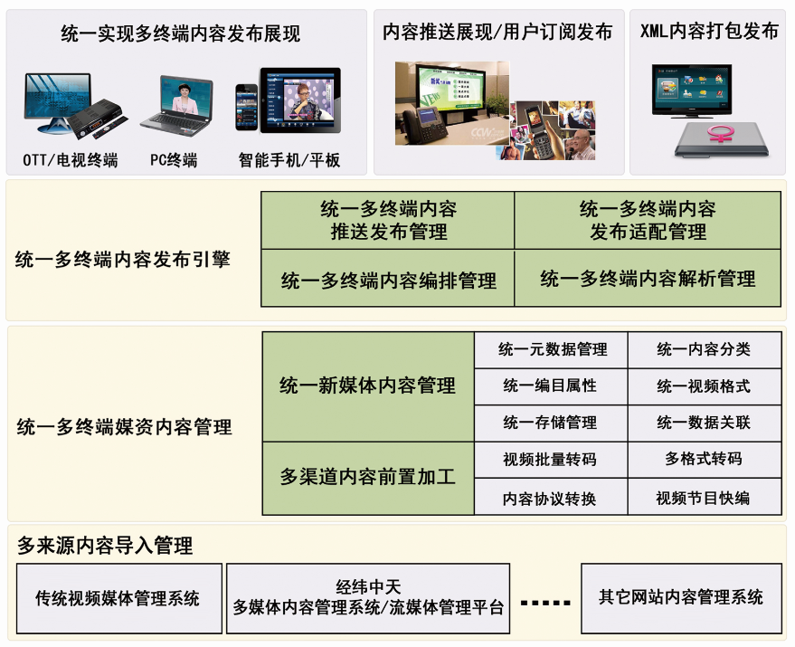 经纬中天针对多屏幕应用专门开发了统一多终端内容发布引擎技术,支持包括PC、平板电脑、智能手机及电视机终端等的内容发布管理。其中,经纬中天统一多终端内容发布引擎支持应用的互联网电视机终端包括XML接口、标准浏览器接口、Android终端等。