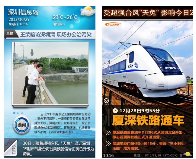 支持通过户外大屏发布系统向民众提供生活服务类应用,包括:天气、火车、公交、航班、餐饮等随时随地查询;城市资讯、消费、民生等信息随时随地公开播报;电子报刊随时随地阅览,并可扩展水电煤缴费等更多生活服务应用,为无线城市的实现提供便利途径。