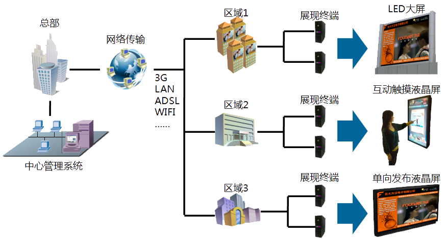 系统支持对各种类型的户外大屏实现多媒体内容的多点发布、分组定向发布、个性化发布、应急发布、即时插播等统一发布和推送管理。例如:紧急公告即时发布、 公益宣传播放、政府信息公开等,并可灵活选择各个对应的区域或单个终端进行定向或者整体内容更新发布。终端呈现方面支持终端呈现内容模板的制作、修改、管理功能;支持对播出任务进行编单、播出策略、内容上线下线等管理。