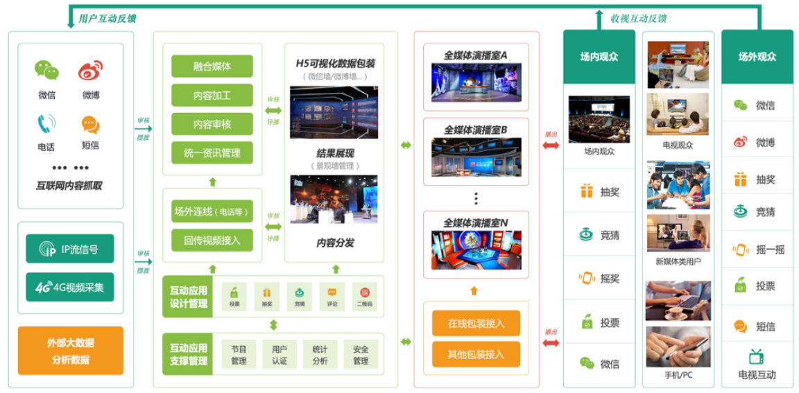 电视媒体要获得全媒体时代的主导权,必须以互动直播作为全媒体节目制作的主要形式。以互动技术为基础,形成传统媒体与新媒体交互的形态,增强传统媒体与新媒体端互动传播的影响力和渗透力,融合媒体演播室互动应用平台使传统媒体时代的观众延伸扩展至新媒体端用户,既涵盖了电视观众又容纳了现场观众,并将互动范围拓展为演播室场内与场外、电视终端与新媒体终端。带动用户以各种互动方式参与到电视节目中。