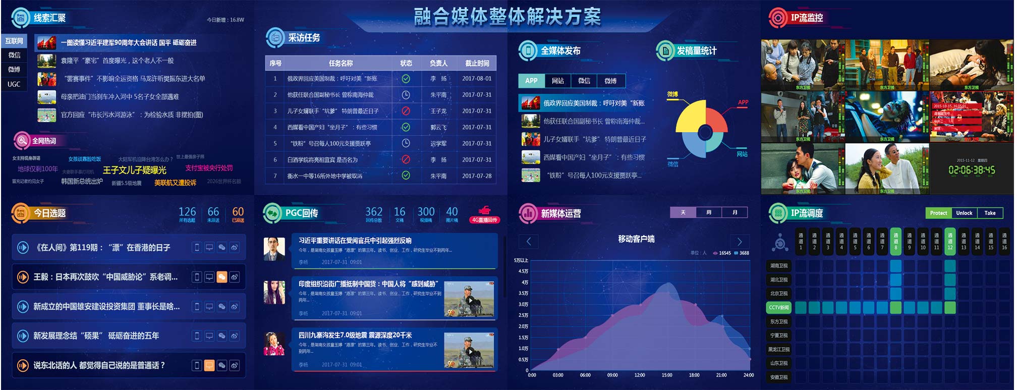 经纬中天融媒体中心平台集多渠道多形态内容采集、内容采编调度、内容编辑加工、融合媒体内容媒资管理、多屏内容编排发布、多模式应用交付、内容传输分发、多终端应用支持等于一体,具有完整的融合媒体流程化应用管理,可为电视台、电台、报业集团、互联网视频公司及其它拥有大量数字资源内容的单位提供多种与视音频内容汇聚管理、内容资源挖掘应用等业务相关的全方位综合应用解决方案。