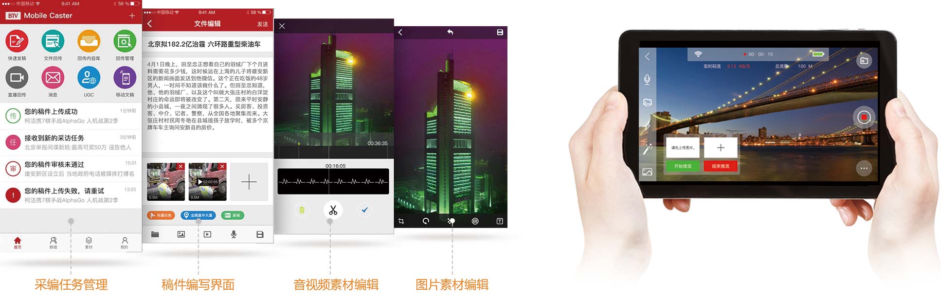 LivePGC移动采编客户端:支持全媒体记者运用4G/5G传输、移动手机终端、新闻发布系统等前沿技术,支持记者第一时间收集、制作、回传来自新闻现场的最新动态、包括直播与图、文、音、视等不同形式的新闻内容,无论记者身处何种场景,都可通过云平台将新闻外场产生的稿件、采录资源等高效回传到台内中心汇聚平台,及时开展节目内容生产。具有专门的素材库,既可使用本机素材,也可在素材库中对图片、视频进行裁剪。具有草稿库、断点上传等技术,具有严格的用户认证管理。