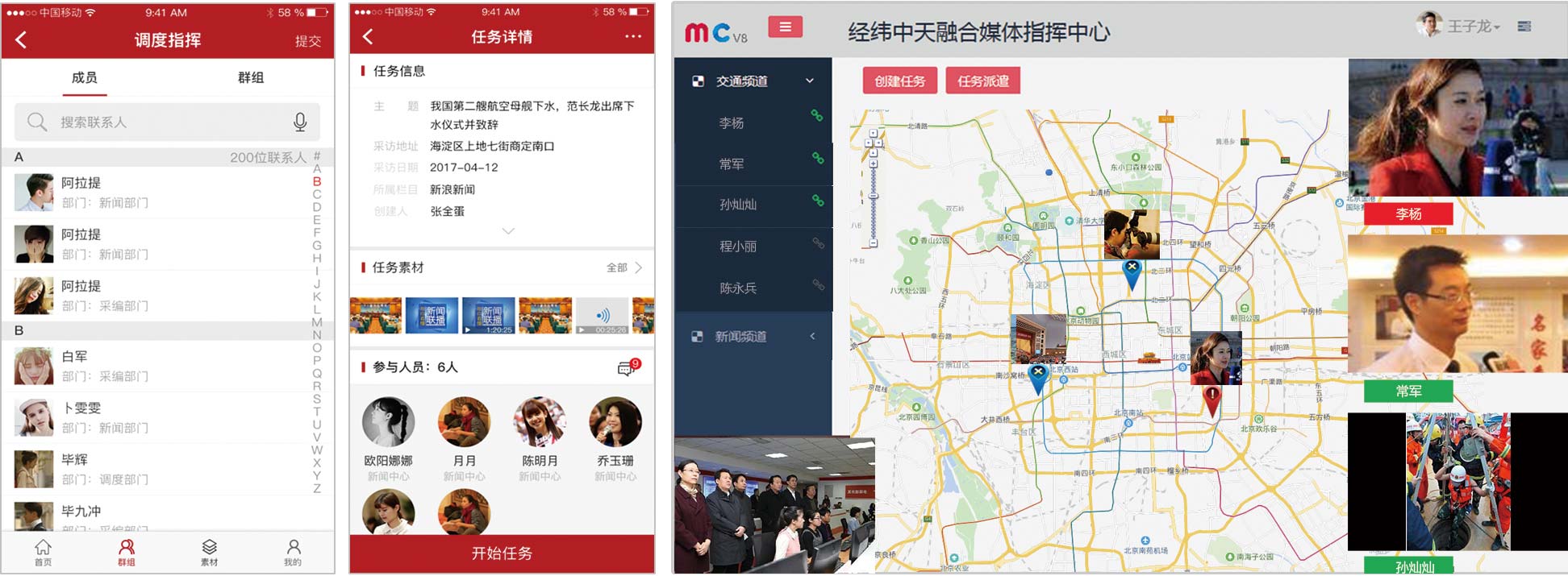 采编指挥调度平台支持利用记者已有手机终端的GPS模块及通信网络,将记者采集的新闻事件稿件及定位信息输送到监控调度中心,新闻事件稿件及采访的位置可以数据图形的方式呈现到监控调度中心,最终调度中心可按新闻事件内容及位置信息指挥其他记者协同采访或进行深度报道。使用4G、5G等无线网络技术实现信息和图像的传输,将手机摄像头上的图像信息通过4G、5G传输到监控中心,实现记者现场视频的远程监控及采访调度。