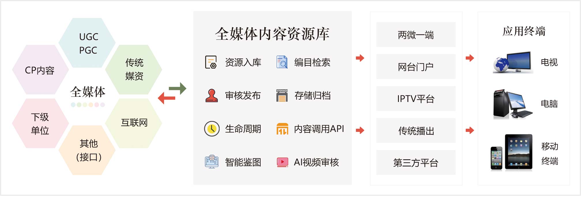 平台以多终端、多形态融合内容汇聚及应用为核心,实现对多种媒体资源内容的元数据定义、审核标记、属性编目、分类存储、检索应用、AI智能审核等流程化管理,为不同新媒体应用提供针对性的内容打包分发等支持,满足各类新媒体业务需要的内容汇聚存储和再利用,为不同业务系统提供简洁、高效的资源检索与标准化内容输出服务,有效实现了融合媒体内容资源的统一聚合、统一管理、统一调度应用。