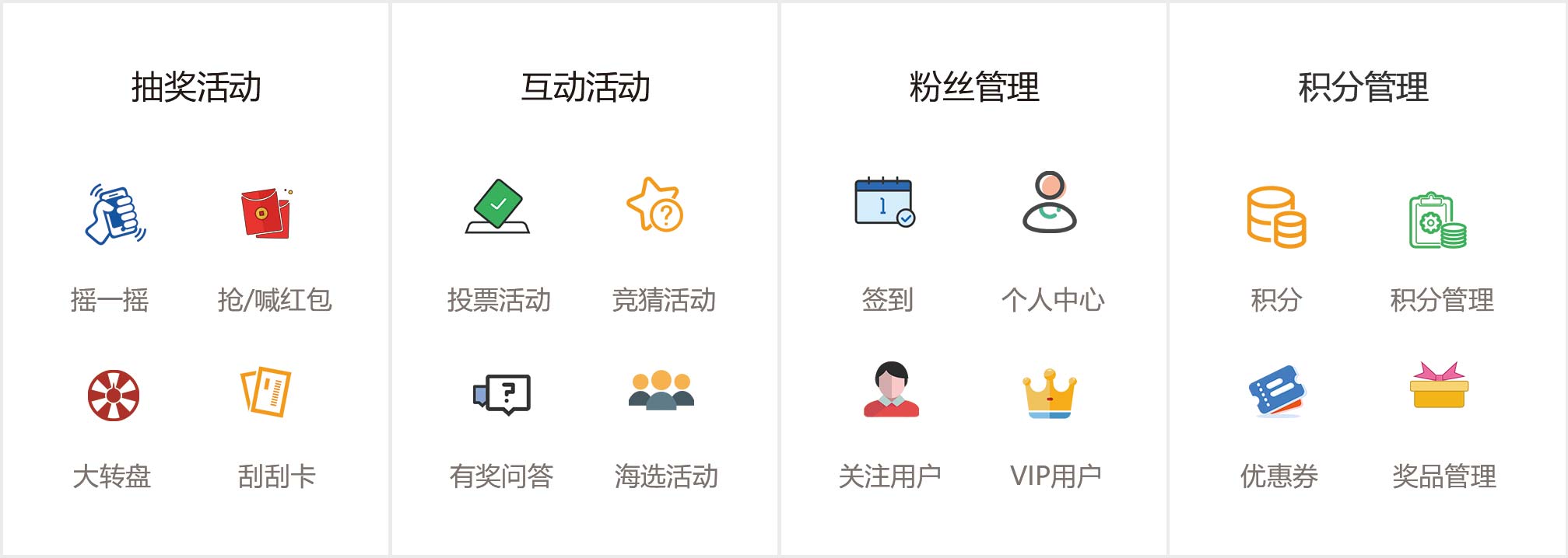微信矩阵互动应用:可以统一管理客户的微信矩阵,能够为微信公众号提供多样化的互动功能,包括抽奖、调查问卷、有奖问答、竞猜、投票、海选等。以丰富媒体与粉丝的互动手段,吸引更多的粉丝,并探讨更多的收入模式;支持媒体的日常活动,如活动报名,用户互动留言的留存与筛选等;支持在统一管理用户、统一管理广告、统一管理积分/优惠券/奖品/中奖码、统一管理互动活动的基础上,实现整合营销与用户资源的统一管理;支持活动广告、微信商城等。