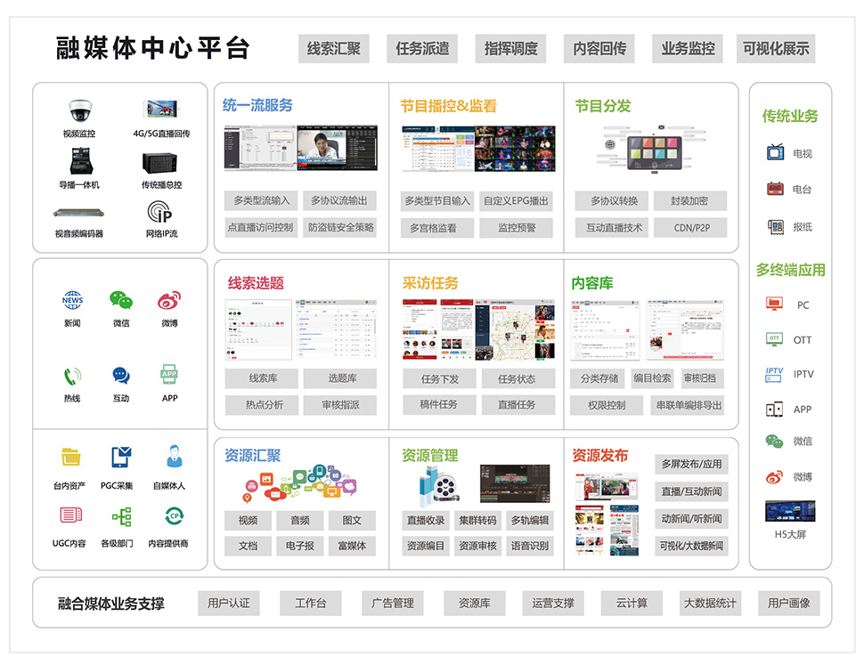 多形态、多渠道内容采集汇聚: 支持视频、音频、图片、文字及富媒体形式等在内的多形态内容采集收录。支持传统报业、电视台、电台视音频节目内容的采编汇聚;支持互联网用户采集上传(UGC);支持全媒体记者采集回传(PGC),支持互联网网站、论坛、贴吧、博客、微博、微信、天气等的采集汇聚。