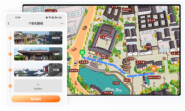 结合LBS位置服务实现定位,景区路线导航规划,游客可通过手绘地图获取前往目的地的交通路线和交通方式,轻松实现"想去哪、就到哪,走到哪、讲到哪”。