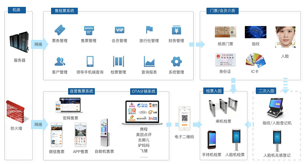 实现线上线下一体化售验票管理;实现景区产品的统一管理、营销、查询、统计、分析等功能。