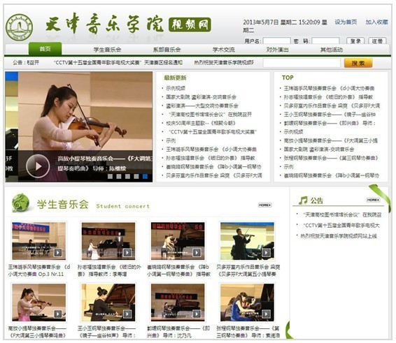 天津音乐学院建设了首个学院视频门户网站平台(天津音乐学院视频网),平台包括学生音乐会、系部音乐会、学术交流、对外演出等栏目模块,为师生提供了随时随地通过网络了解音乐资讯、观看校园音乐视频的有效途径,得到了校方的一致好评。